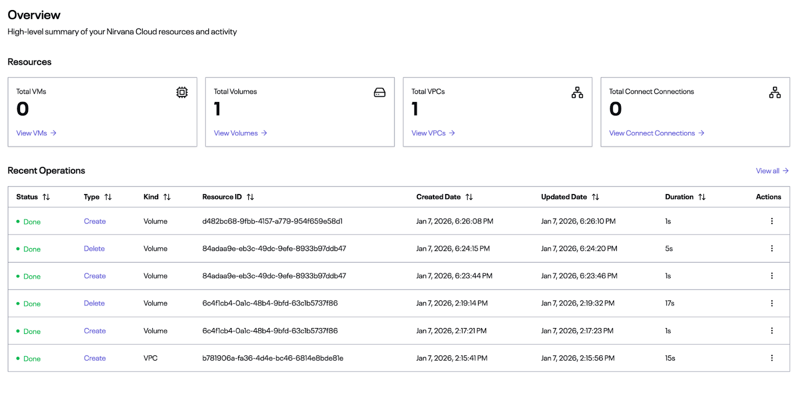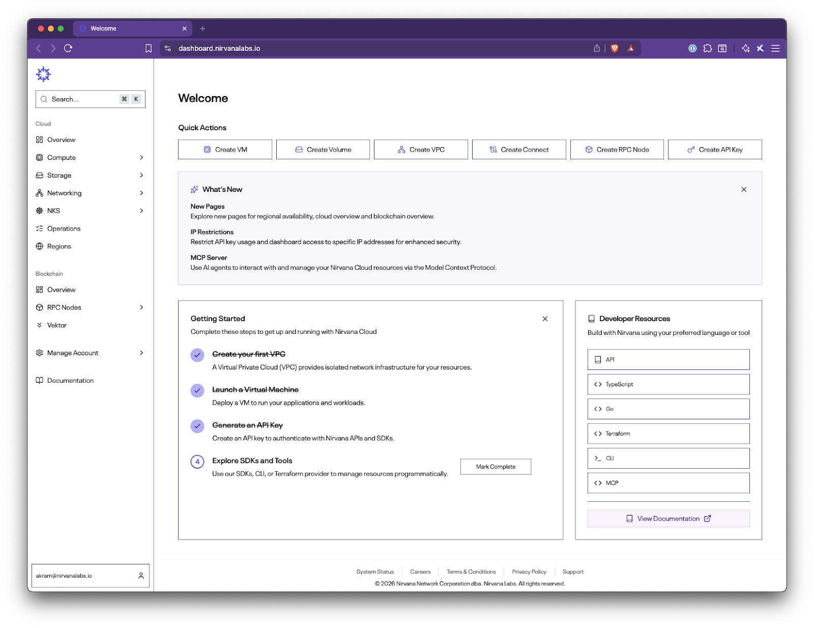 - Quick Actions for common workflows such as VMs, volumes, VPCs, RPC nodes, and API keys